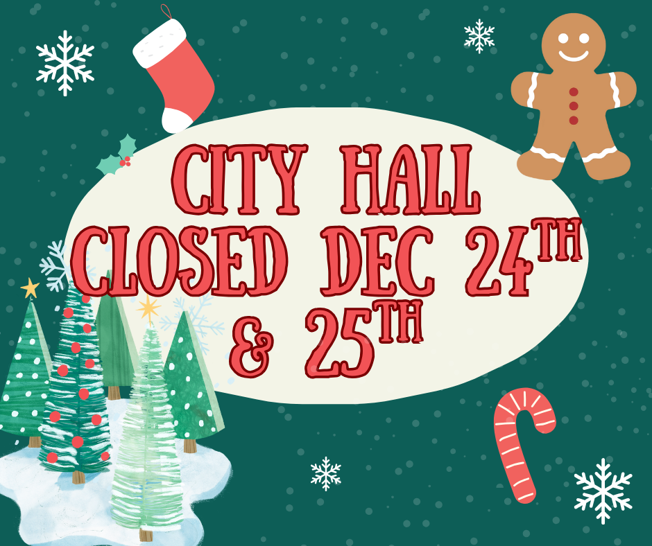 Posted on December 8, 2025, Edited December 8, 2025 by Sarah Claeys City Hall Closed for Christmas City Hall will be closed December 24th and 25th for Christmas.