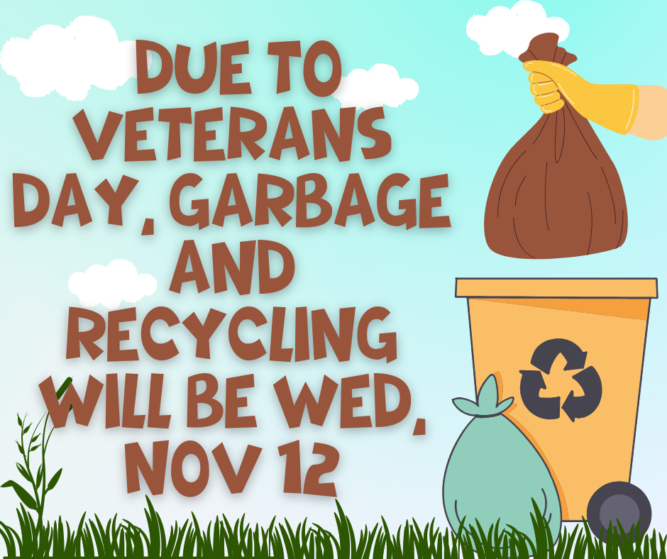Posted on November 3, 2025, Edited October 28, 2025 by Sarah Claeys Garbage/Recycling – Nov 12 Due to Veteran’s Day, garbage and recycling pickup will occur one day later (Wednesday, November 12th).